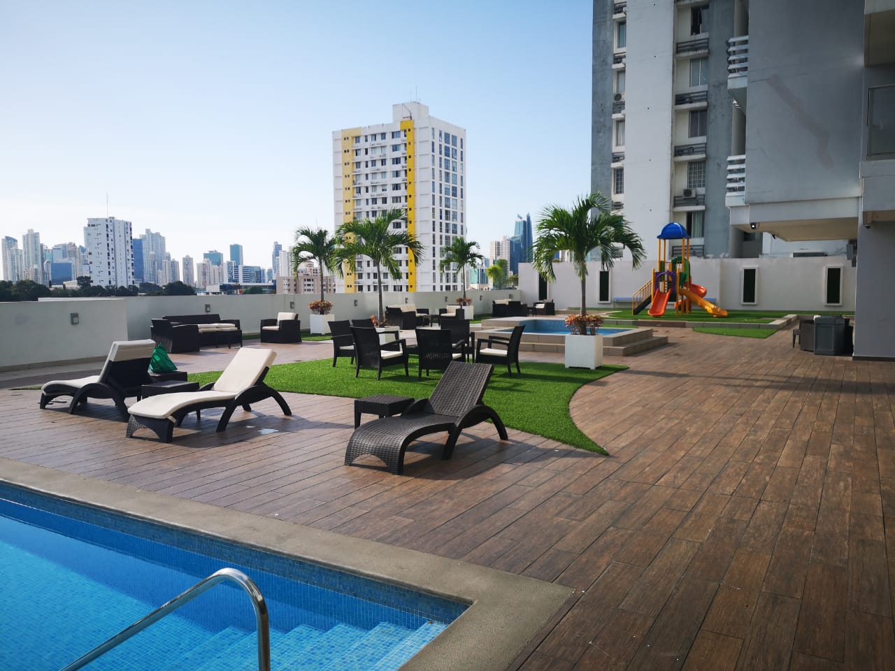 - Amplia área social con piscina, amplias áreas de esparcimiento
